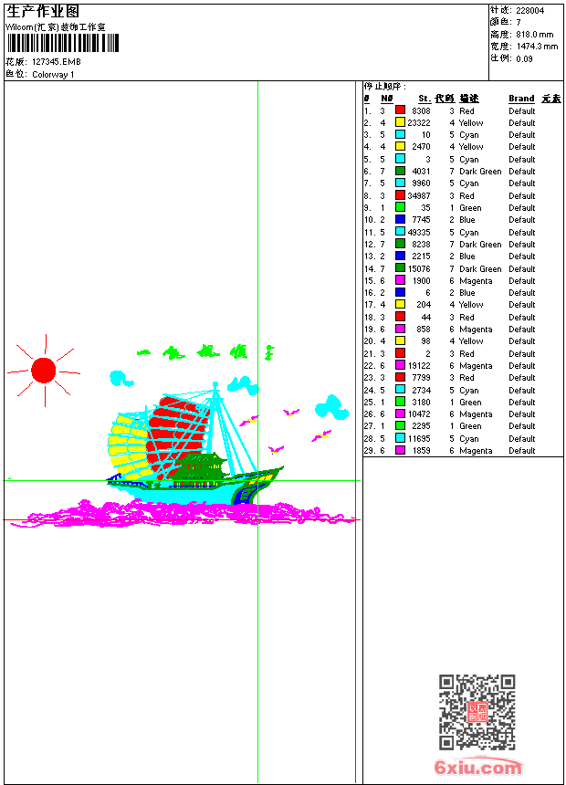 - emb花版参数: 大小:655.00 KB / 尺寸:1474*818[毫米] / 针数:228004针 / 线色:7 / 格式:emb / 版本:2006