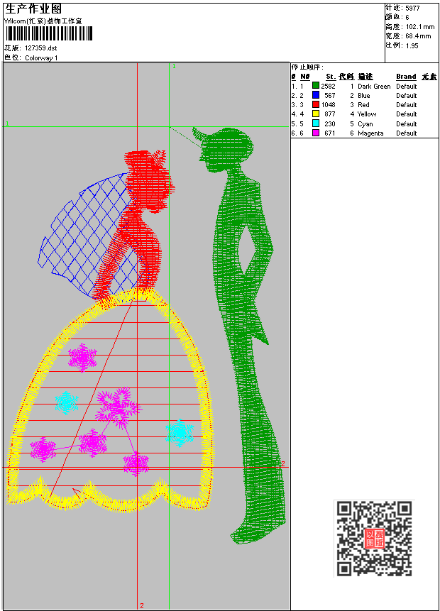 - dst花版参数: 大小:18.01 KB / 尺寸:68*102[毫米] / 针数:5977针 / 线色:6 / 格式:dst / 版本:6