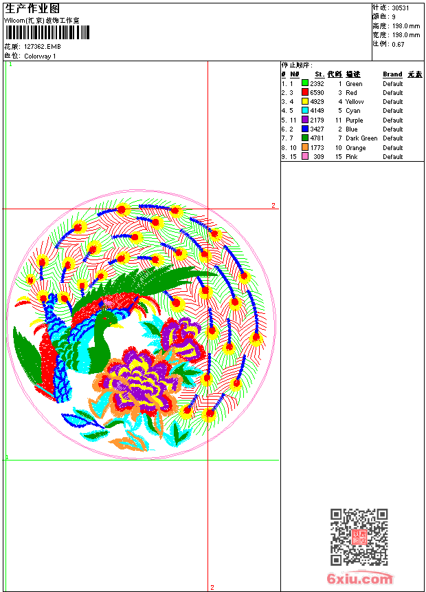 - emb花版参数: 大小:244.50 KB / 尺寸:198*198[毫米] / 针数:30531针 / 线色:9 / 格式:emb / 版本:8
