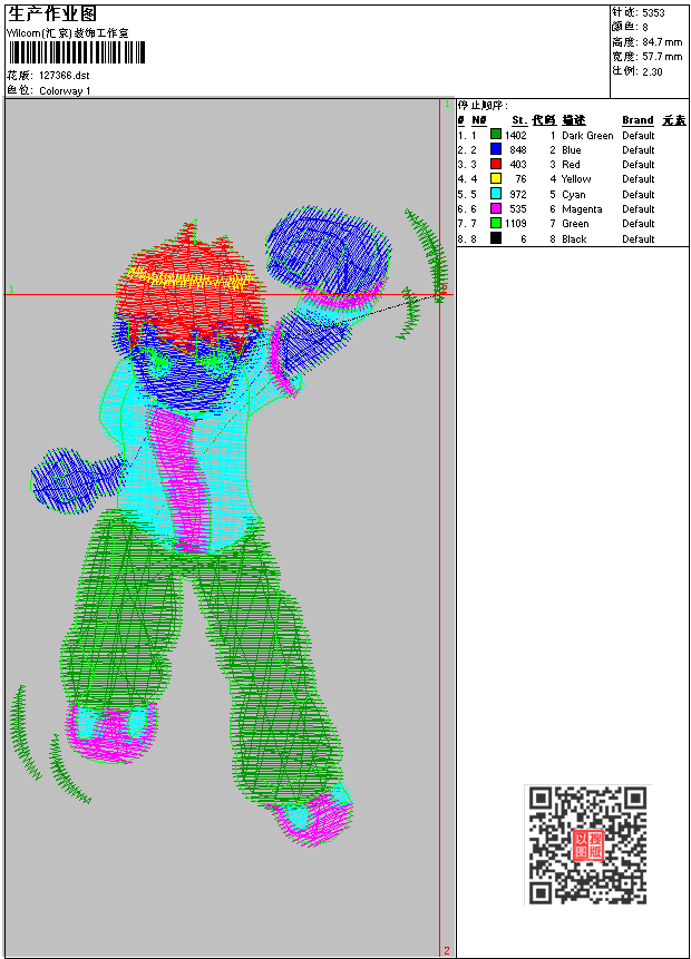 - dst花版参数: 大小:16.18 KB / 尺寸:58*85[毫米] / 针数:5353针 / 线色:8 / 格式:dst / 版本:6