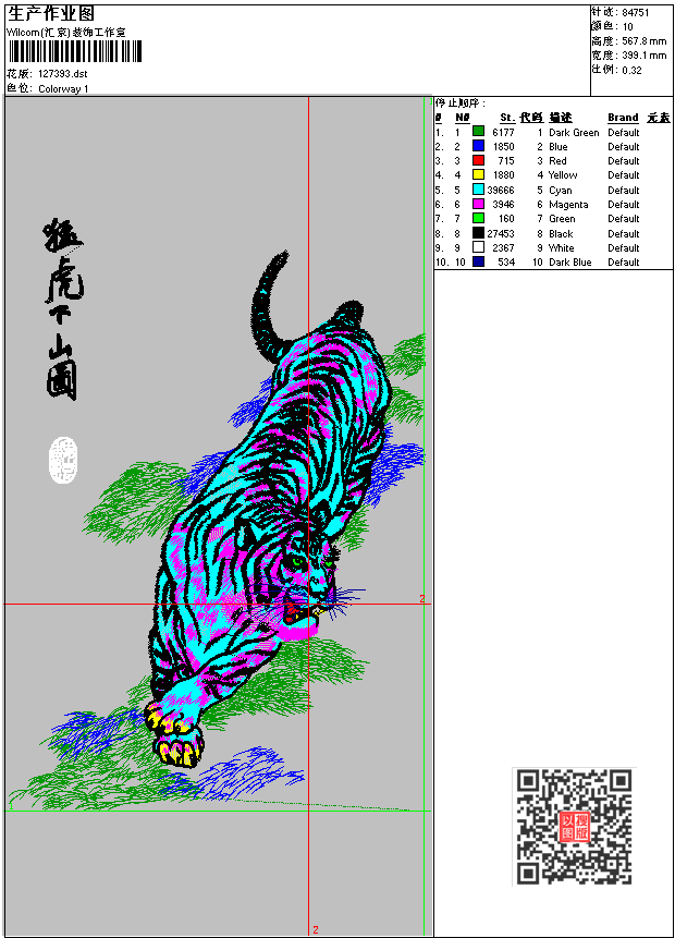 - dst花版参数: 大小:248.79 KB / 尺寸:399*568[毫米] / 针数:84751针 / 线色:10 / 格式:dst / 版本:6