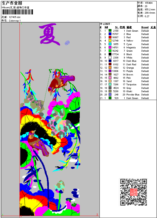 - dst花版参数: 大小:456.02 KB / 尺寸:299*955[毫米] / 针数:155484针 / 线色:20 / 格式:dst / 版本:6