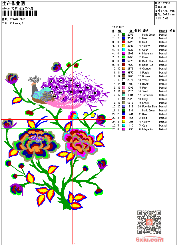 - emb花版参数: 大小:302.50 KB / 尺寸:308*431[毫米] / 针数:87136针 / 线色:20 / 格式:emb / 版本:9