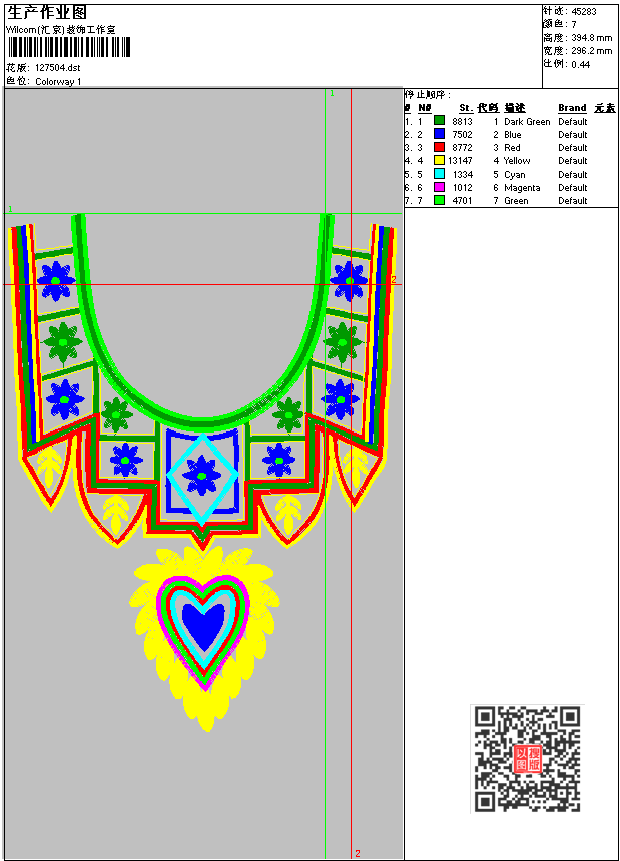 - dst花版参数: 大小:133.17 KB / 尺寸:296*395[毫米] / 针数:45283针 / 线色:7 / 格式:dst / 版本:6