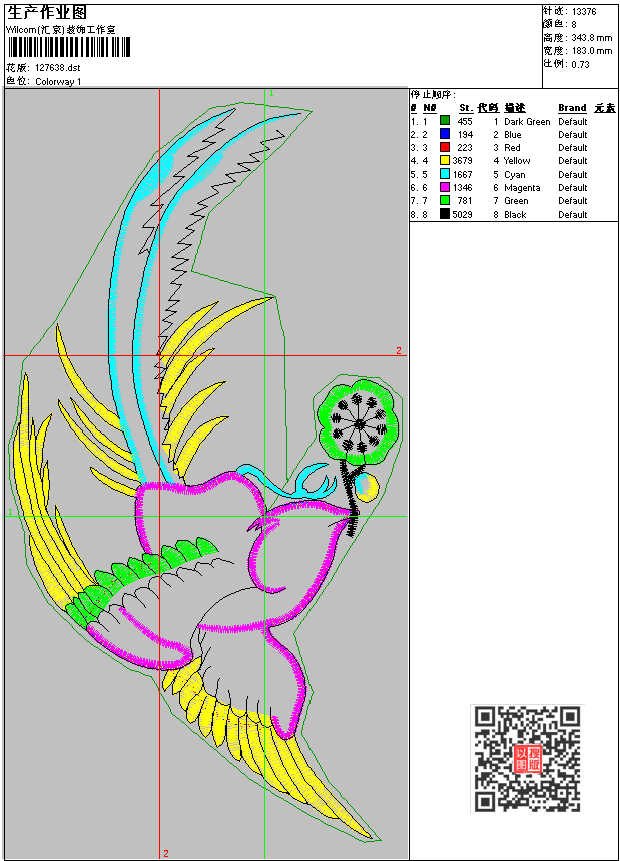 - dst花版参数: 大小:39.69 KB / 尺寸:183*344[毫米] / 针数:13376针 / 线色:8 / 格式:dst / 版本:6