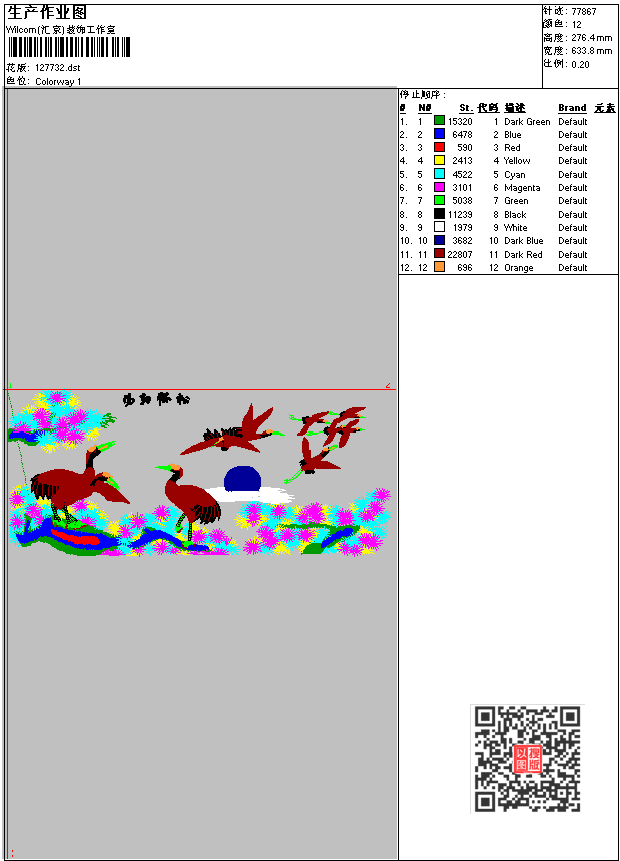 - dst花版参数: 大小:228.63 KB / 尺寸:634*276[毫米] / 针数:77867针 / 线色:12 / 格式:dst / 版本:6