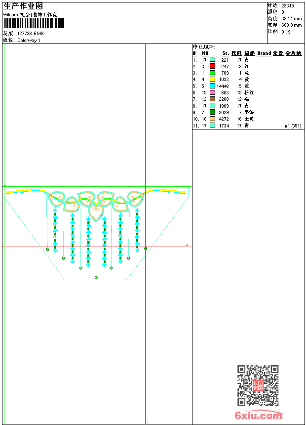 - emb花版参数: 大小:153.50 KB / 尺寸:660*332[毫米] / 针数:29315针 / 线色:9 / 格式:emb / 版本:7