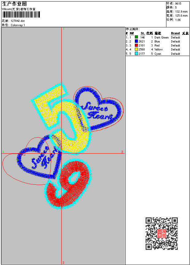 - dst花版参数: 大小:28.67 KB / 尺寸:126*133[毫米] / 针数:9615针 / 线色:5 / 格式:dst / 版本:6