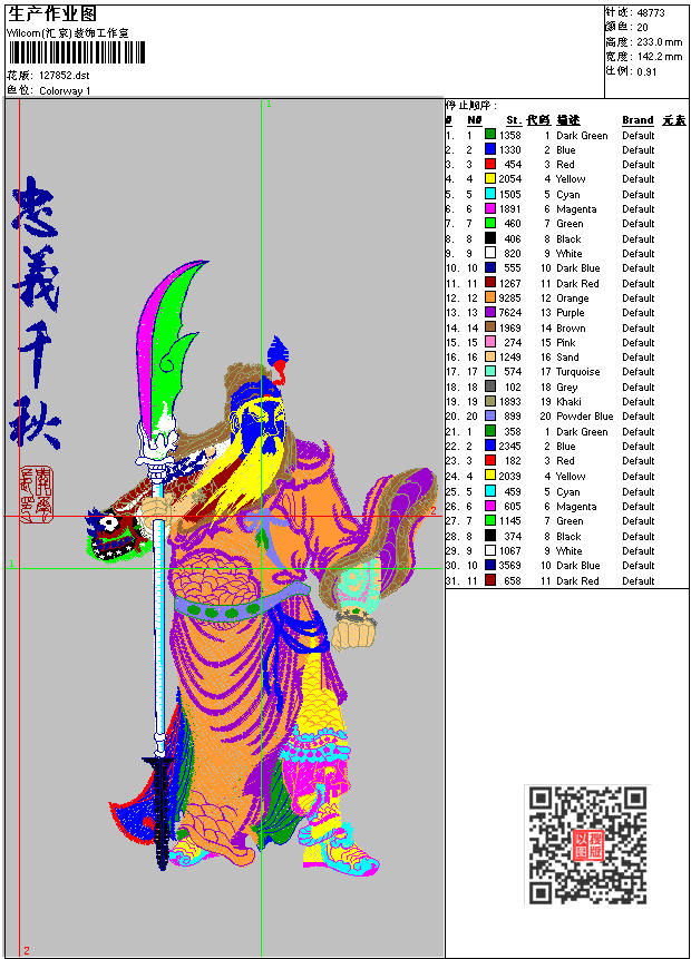 - dst花版参数: 大小:143.39 KB / 尺寸:142*233[毫米] / 针数:48773针 / 线色:20 / 格式:dst / 版本:6