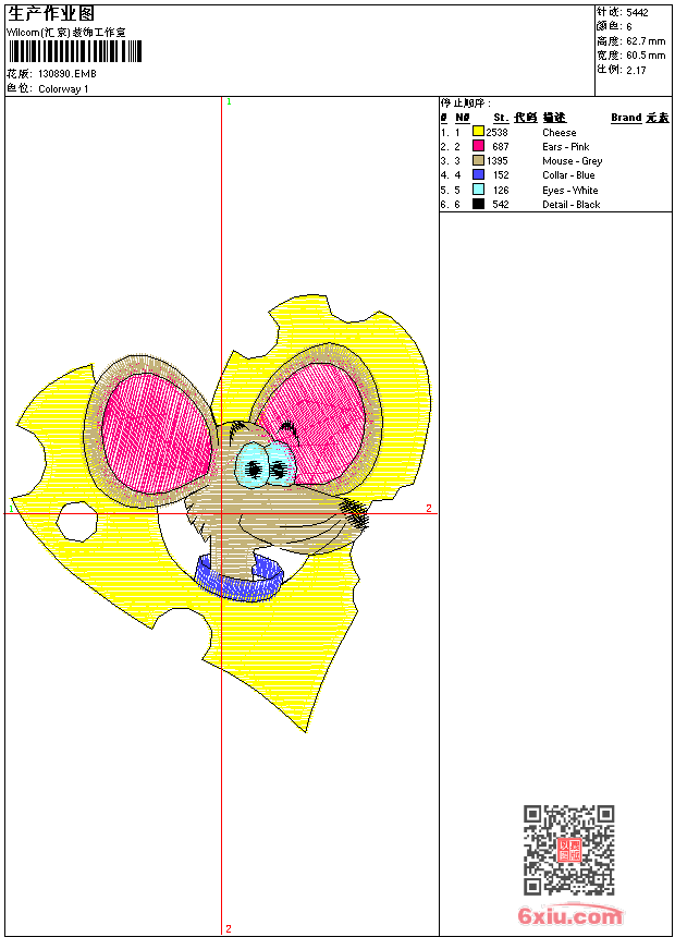 - emb花版参数: 大小:41.00 KB / 尺寸:60*63[毫米] / 针数:5442针 / 线色:6 / 格式:emb / 版本:8
