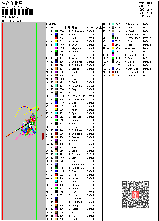 - dst花版参数: 大小:121.74 KB / 尺寸:235*211[毫米] / 针数:41383针 / 线色:20 / 格式:dst / 版本:6