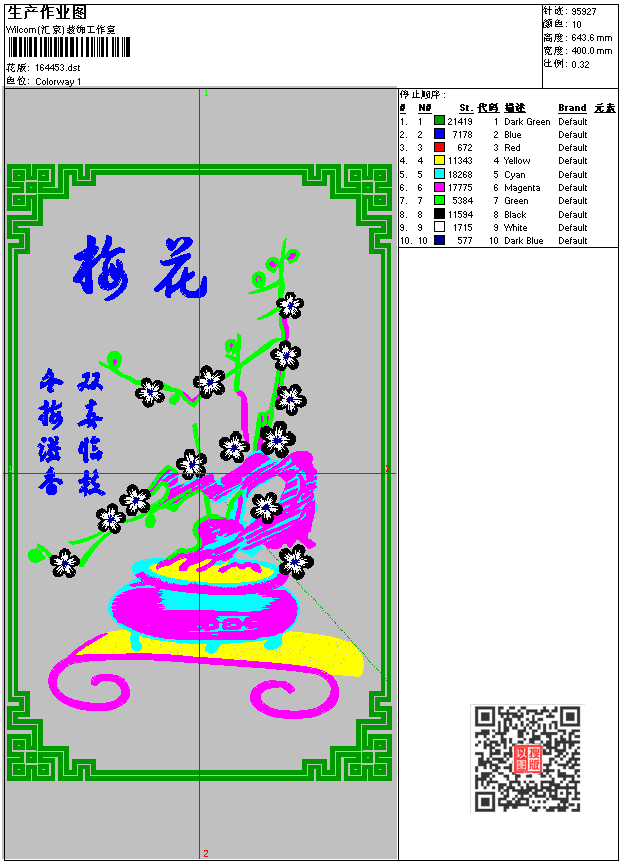 - dst花版参数: 大小:281.54 KB / 尺寸:400*644[毫米] / 针数:95927针 / 线色:10 / 格式:dst / 版本:6