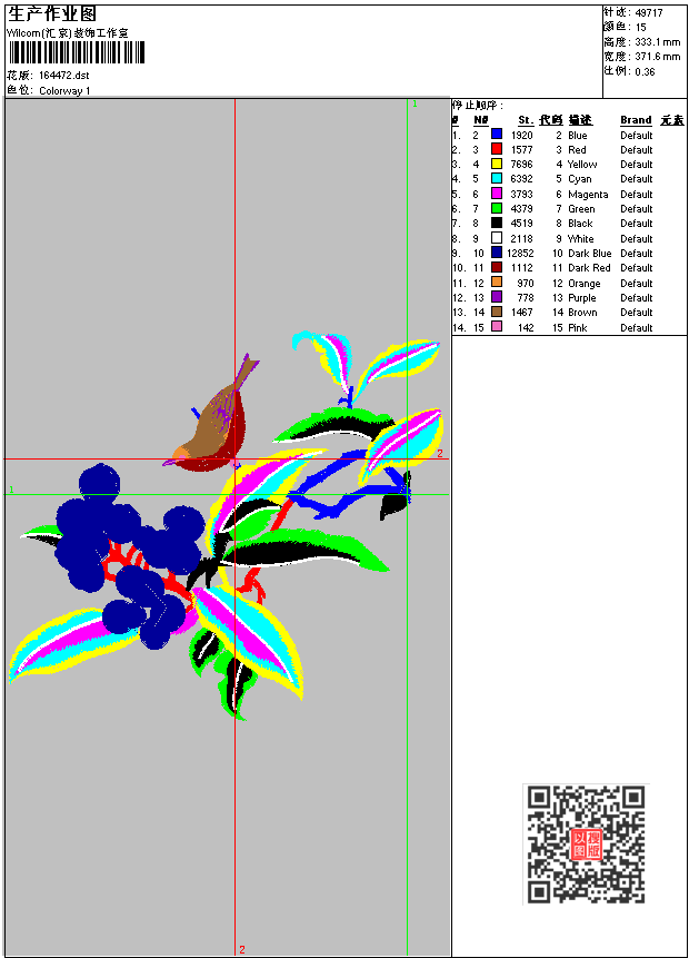 - dst花版参数: 大小:146.16 KB / 尺寸:372*333[毫米] / 针数:49717针 / 线色:15 / 格式:dst / 版本:6