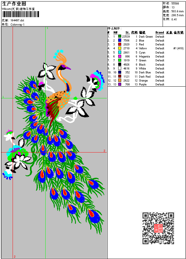 - dst花版参数: 大小:163.36 KB / 尺寸:281*504[毫米] / 针数:55588针 / 线色:13 / 格式:dst / 版本:6