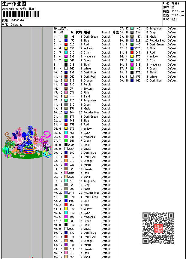- dst花版参数: 大小:226.00 KB / 尺寸:259*172[毫米] / 针数:76969针 / 线色:20 / 格式:dst / 版本:6