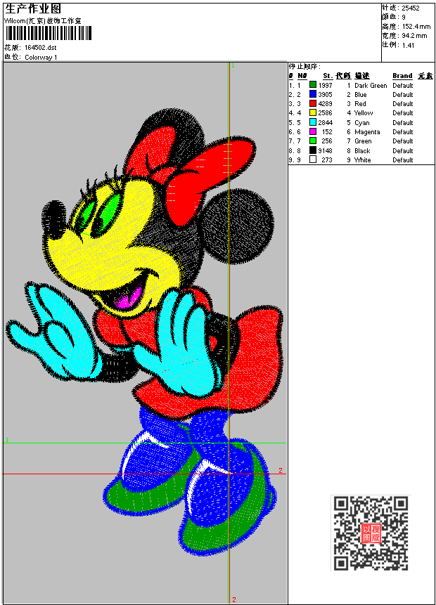 - dst花版参数: 大小:75.07 KB / 尺寸:94*152[毫米] / 针数:25452针 / 线色:9 / 格式:dst / 版本:6