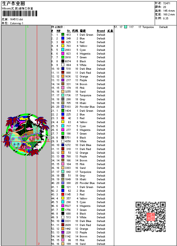 - dst花版参数: 大小:212.82 KB / 尺寸:160*145[毫米] / 针数:72471针 / 线色:20 / 格式:dst / 版本:6