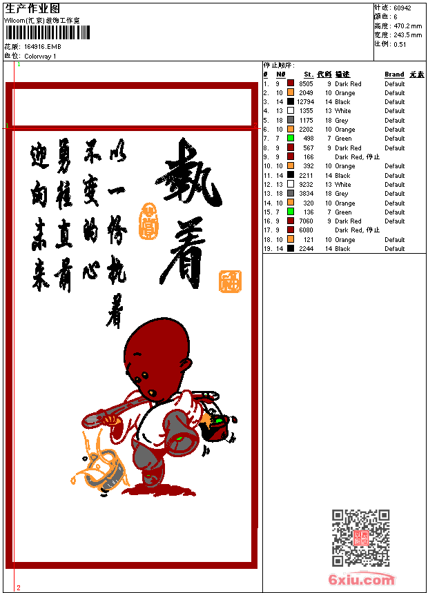 - emb花版参数: 大小:155.50 KB / 尺寸:244*470[毫米] / 针数:60942针 / 线色:6 / 格式:emb / 版本:9