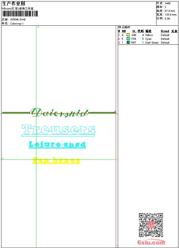 英文字母裤袋图 点此上传花版兑乐绣币/现金 emb花版参数: 大小:30.50 KB / 尺寸:139*68[毫米] / 针数:3445针 / 线色:3 / 格式:emb / 版本:9 版带文件需绣花软件方可打开,可配色打印导出各种格式或直接上机绣。如无绣花软件可下载1:1模拟效果图。 PNG图片信息:大小:0.0 (MB) /图宽*高:525x257(像素) 上传作者( 江南*** ) 获得乐绣币:2个 emb下载 1:1图下载 关闭 相似花型推荐: 英文字母口袋裤袋图 休闲裤袋图案 吉祥花纹裤袋图案 牛仔裤裤袋样式图案 翅膀形状的裤袋刺绣图案_花版下载 牛仔裤裤袋图案 口袋_裤袋图案 裤袋图片,女裤袋,刺绣裤袋图案 牛仔裤后裤袋版带,电脑图案,图片 裤子后面裤袋的图案 经典图案裤袋水洗牛仔裤 牛仔裤后裤袋 F字母电脑裤袋图案_裤袋刺绣图案 裤袋 裤袋线条 上一个花样:S字母裤袋图案 下一个花样:英文字母口袋裤袋图
