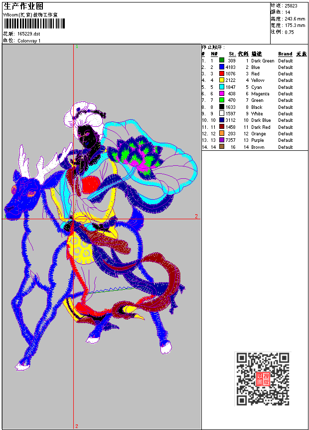- dst花版参数: 大小:76.15 KB / 尺寸:175*244[毫米] / 针数:25823针 / 线色:14 / 格式:dst / 版本:6
