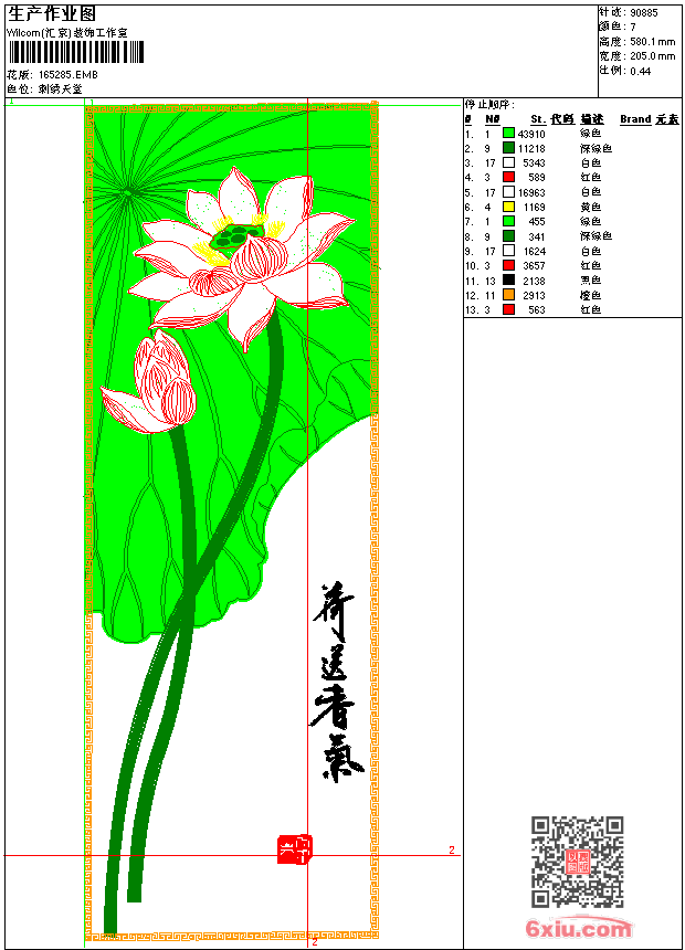 - emb花版参数: 大小:156.50 KB / 尺寸:205*580[毫米] / 针数:90885针 / 线色:7 / 格式:emb / 版本:9