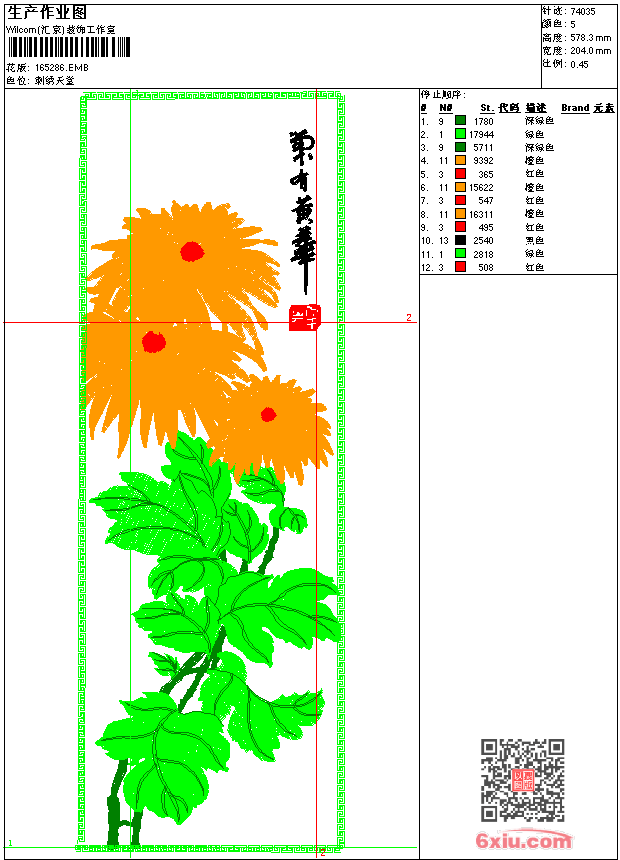 - emb花版参数: 大小:262.50 KB / 尺寸:204*578[毫米] / 针数:74035针 / 线色:5 / 格式:emb / 版本:9