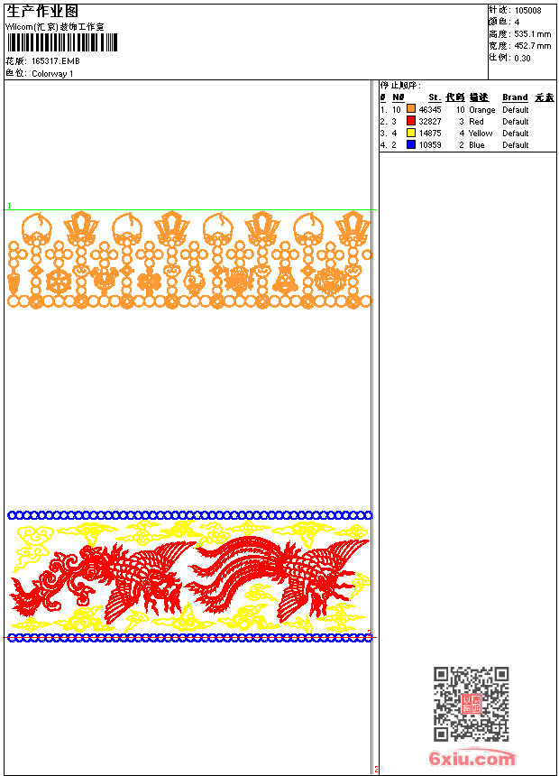 - emb花版参数: 大小:970.00 KB / 尺寸:453*535[毫米] / 针数:105008针 / 线色:4 / 格式:emb / 版本:9