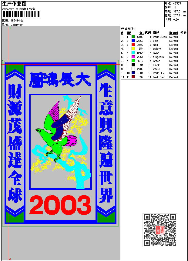 - dst花版参数: 大小:198.42 KB / 尺寸:257*368[毫米] / 针数:67555针 / 线色:11 / 格式:dst / 版本:6