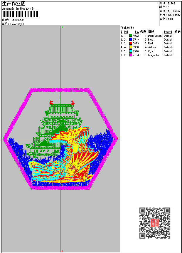 - dst花版参数: 大小:64.26 KB / 尺寸:133*117[毫米] / 针数:21762针 / 线色:6 / 格式:dst / 版本:6