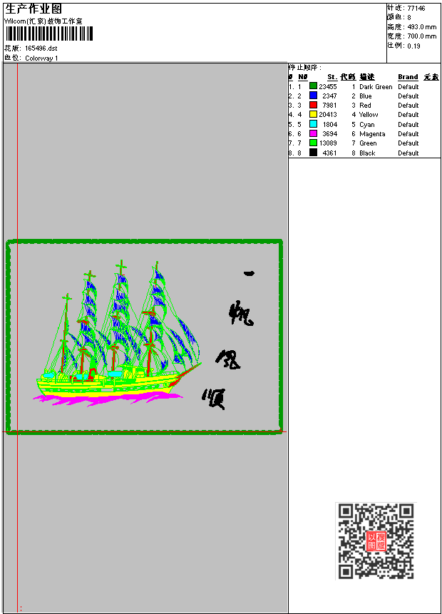 - dst花版参数: 大小:226.51 KB / 尺寸:700*493[毫米] / 针数:77146针 / 线色:8 / 格式:dst / 版本:6