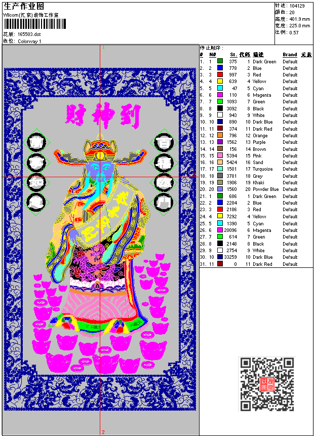 - dst花版参数: 大小:305.57 KB / 尺寸:225*402[毫米] / 针数:104129针 / 线色:20 / 格式:dst / 版本:6