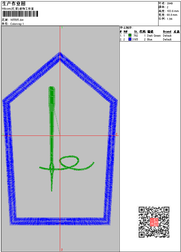 - dst花版参数: 大小:12.07 KB / 尺寸:69*104[毫米] / 针数:3949针 / 线色:2 / 格式:dst / 版本:6