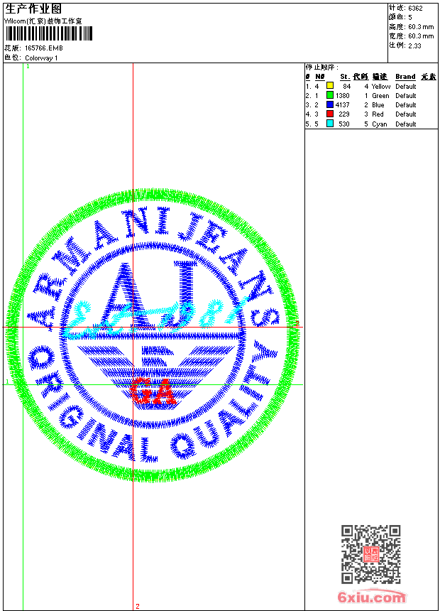 - emb花版参数: 大小:54.00 KB / 尺寸:60*60[毫米] / 针数:6362针 / 线色:5 / 格式:emb / 版本:7