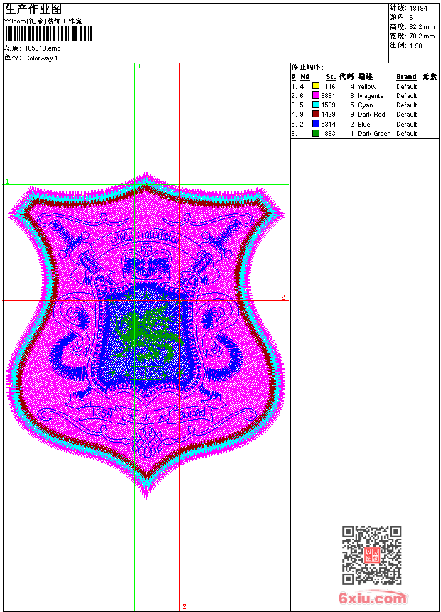 - emb花版参数: 大小:170.00 KB / 尺寸:70*82[毫米] / 针数:18194针 / 线色:6 / 格式:emb / 版本:9
