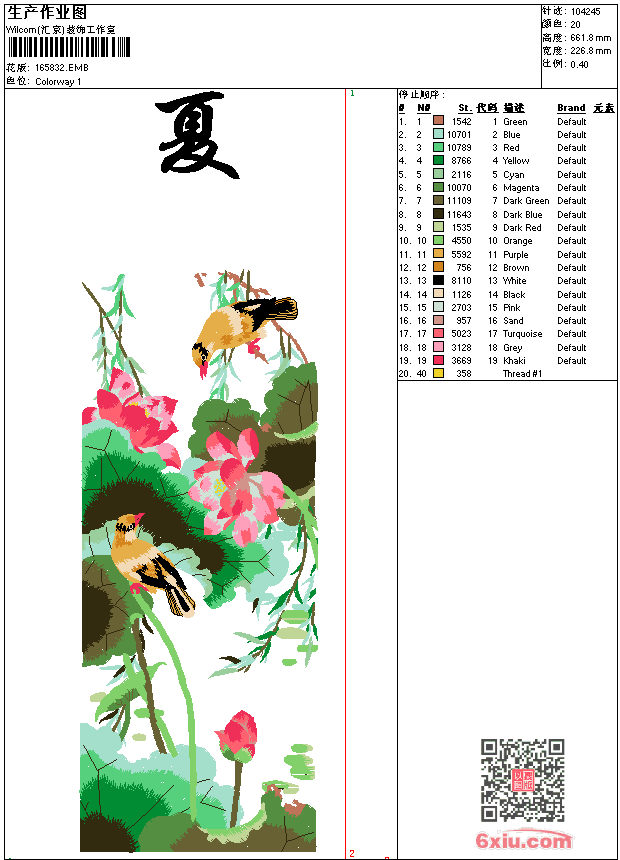 夏-四季刺绣工艺挂画之夏天_威尔克姆2006版EMB格式 点此上传花版兑乐绣币/现金 emb花版参数: 大小:566.50 KB / 尺寸:227*662[毫米] / 针数:104245针 / 线色:20 / 格式:emb / 版本:2006 版带文件需绣花软件方可打开,可配色打印导出各种格式或直接上机绣。如无绣花软件可下载1:1模拟效果图。 PNG图片信息:大小:2.3 (MB) /图宽*高:858x2504(像素) 上传作者( 雪花*** ) 获得乐绣币:30个 emb下载 1:1图下载 关闭 相似花型推荐: 春-四季刺绣工艺挂画之春天_威尔克姆2006版 十二生肖之牛_刺绣图_EMB版带 中国结_刺绣_图_EMB版带 傲梅_电脑十字绣_十字绣图 鸿星尔克 熊_熊 十字绣图案_文字诚信十字绣图 米老鼠图案_卡通公仔电脑_EMB版带 苍鹰劲松图_乱针绣_工艺刺绣挂画 电脑财神到图案_财神到刺绣图案 凤凰_吉祥圆形凤凰刺绣_家纺凤凰 鹰_老鹰图案_单针刺绣鹰 花环 王冠 领结 字母logo电脑,logo刺绣图案_威尔克姆2006版 蝴蝶_裤袋刺绣_裤袋_威尔克姆2006版EMB 上一个花样:秋-四季刺绣工艺挂画之秋天_威尔克姆2006版EMB文件 下一个花样:春-四季刺绣工艺挂画之春天_威尔克姆2006版EMB格式