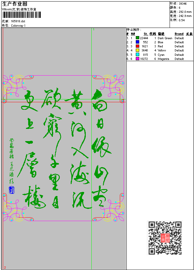 - dst花版参数: 大小:115.77 KB / 尺寸:243*292[毫米] / 针数:39346针 / 线色:6 / 格式:dst / 版本:6