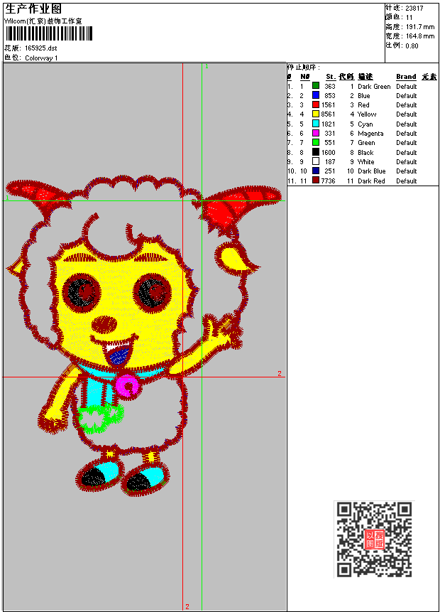 - dst花版参数: 大小:70.28 KB / 尺寸:165*192[毫米] / 针数:23817针 / 线色:11 / 格式:dst / 版本:6