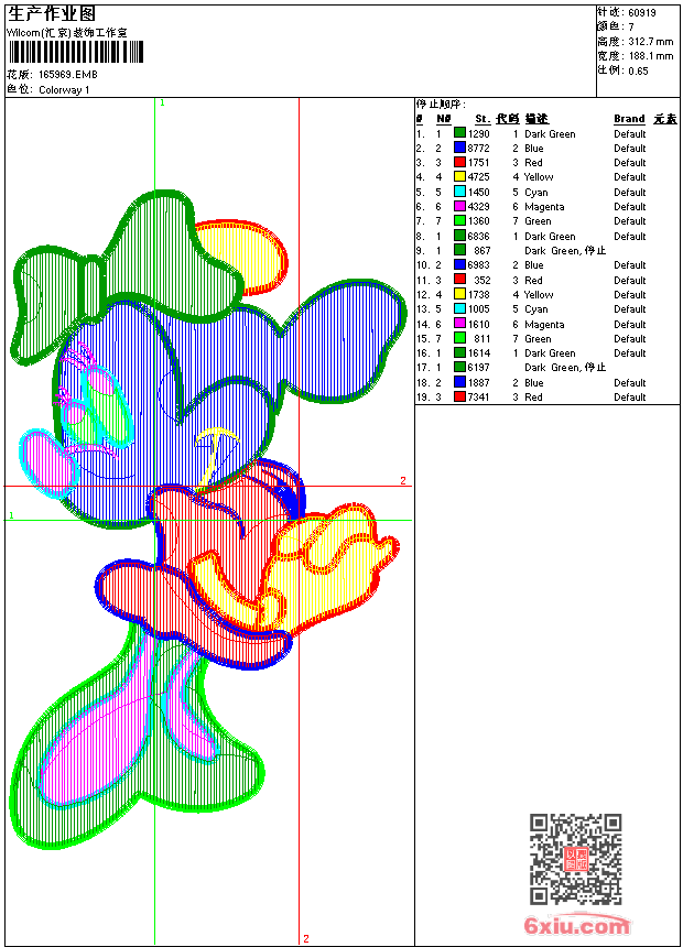 - emb花版参数: 大小:64.00 KB / 尺寸:188*313[毫米] / 针数:60919针 / 线色:7 / 格式:emb / 版本:9