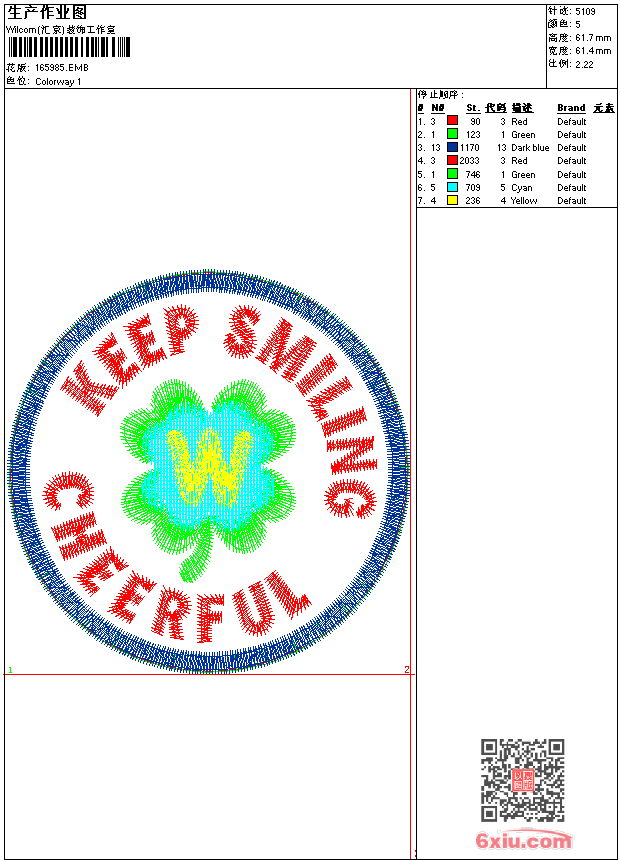 - emb花版参数: 大小:47.50 KB / 尺寸:61*62[毫米] / 针数:5109针 / 线色:5 / 格式:emb / 版本:9