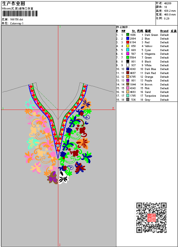 - dst花版参数: 大小:141.74 KB / 尺寸:461*438[毫米] / 针数:48209针 / 线色:18 / 格式:dst / 版本:6