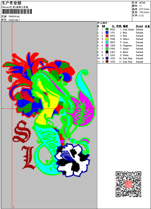 - dst花版参数: 大小:137.34 KB / 尺寸:176*238[毫米] / 针数:46708针 / 线色:11 / 格式:dst / 版本:6
