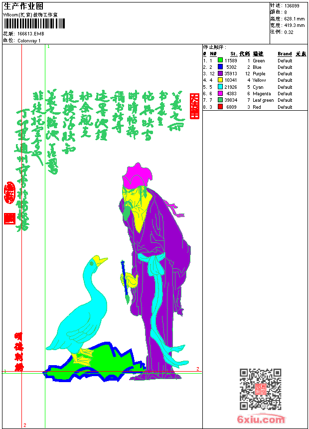 王曦之_王曦之咏鹅刺绣图 点此上传花版兑乐绣币/现金 emb花版参数: 大小:479.00 KB / 尺寸:419*628[毫米] / 针数:136099针 / 线色:8 / 格式:emb / 版本:8 版带文件需绣花软件方可打开,可配色打印导出各种格式或直接上机绣。如无绣花软件可下载1:1模拟效果图。 PNG图片信息:大小:2.7 (MB) /图宽*高:1586x2376(像素) 上传作者( lima*** ) 获得乐绣币:20个 emb下载 1:1图下载 关闭 相似花型推荐: 喜上梅梢_工艺刺绣挂画 美女_美少女头像 卡通_福娃刺绣图 鹰_雄鹰LOGO刺绣 小狗_单针绣小狗 树叶_三片树叶的刺绣图 象_卡通大象刺绣 米奇_刺绣米老鼠 熊猫_卡通刺绣熊猫 花_刺绣小花 知了_蝉_动物刺绣 花_牵牛花刺绣图 竹_竹子与竹字的刺绣图 花_小花朵刺绣 花_小花_童装小花 上一个花样:小龙女刘亦菲 华丽版_乱针绣刺绣版 下一个花样:喜上梅梢_工艺刺绣挂画