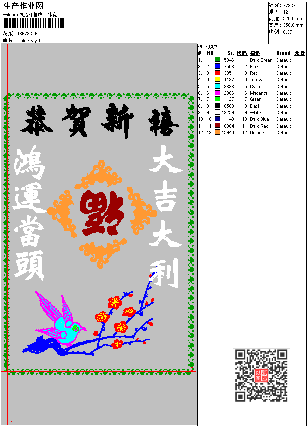 大吉大利,恭贺新禧 点此上传花版兑乐绣币/现金 dst花版参数: 大小:228.54 KB / 尺寸:350*520[毫米] / 针数:77837针 / 线色:12 / 格式:dst / 版本:6 版带文件需绣花软件方可打开,可配色打印导出各种格式或直接上机绣。如无绣花软件可下载1:1模拟效果图。 PNG图片信息:大小:1.5(MB) /图宽*高:1324x1967(像素) 上传作者( lanl*** ) 获得乐绣币:20个 dst下载 1:1图下载 关闭 相似花型推荐: 南海观世音-佛光普照 中国石化 字画。坚毅_工艺字画刺绣 信心_刺绣字画工艺版 童装花_骑车的小女孩 鹰的图 虎头_电脑虎头图案_虎头版带下载 水溶花 房子_城堡刺绣 李宁 adidas_标志刺绣 鳥語花香_毛衣图案 MZ-01_公牛BULIS字母立体刺绣 松鹤朝阳_工艺挂画 笑脸绣贴3 上一个花样:兔子_乱针绣兔子版带 下一个花样:南海观世音-佛光普照