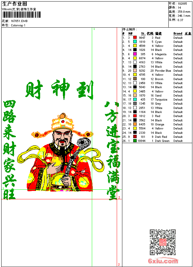 财神_工艺精品版 点此上传花版兑乐绣币/现金 emb花版参数: 大小:740.00 KB / 尺寸:346*360[毫米] / 针数:102895针 / 线色:14 / 格式:emb / 版本:8 版带文件需绣花软件方可打开,可配色打印导出各种格式或直接上机绣。如无绣花软件可下载1:1模拟效果图。 PNG图片信息:大小:1.3 (MB) /图宽*高:1309x1361(像素) 上传作者( 8629*** ) 获得乐绣币:20个 emb下载 1:1图下载 关闭 相似花型推荐: 两只蝴蝶 保罗 袋鼠 小兔 小狗 鸟语 奶牛 梅-梅花刺绣 精品 麻雀 咖啡猫 菊花 金魚 刺猬 人物字画精品拼搏 方福混合绣-毛巾绣刺绣 上一个花样:小熊 下一个花样:两只蝴蝶
