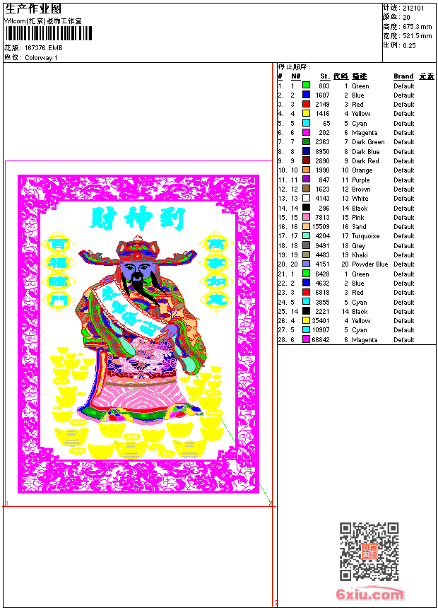 财神到 点此上传花版兑乐绣币/现金 emb花版参数: 大小:727.00 KB / 尺寸:521*675[毫米] / 针数:212101针 / 线色:20 / 格式:emb / 版本:9 版带文件需绣花软件方可打开,可配色打印导出各种格式或直接上机绣。如无绣花软件可下载1:1模拟效果图。 PNG图片信息:大小:5.0 (MB) /图宽*高:1973x2555(像素) 上传作者( 啊冠*** ) 获得乐绣币:28个 emb下载 1:1图下载 关闭 相似花型推荐: 美丽的姑娘 狮子 孔雀 花 卡通女孩 字画-宁静致远-十字绣刺绣 狮子LOGO刺绣 玫瑰大花 家纺 吉祥莲花刺绣 女装胸花 鹰 电脑十字绣-喜羊羊时钟挂画 电脑十字绣-五福图 雷霆队标 龙年飞龙 上一个花样:观世音菩萨 下一个花样:美丽的姑娘