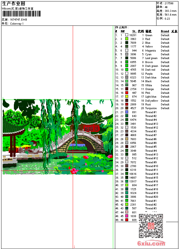 412-乱针绣苏州园林工艺版 点此上传花版兑乐绣币/现金 emb花版参数: 大小:988.50 KB / 尺寸:562*383[毫米] / 针数:217598针 / 线色:46 / 格式:emb / 版本:9 版带文件需绣花软件方可打开,可配色打印导出各种格式或直接上机绣。如无绣花软件可下载1:1模拟效果图。 PNG图片信息:大小:6.9 (MB) /图宽*高:2125x1450(像素) 上传作者( yang*** ) 获得乐绣币:60个 emb下载 1:1图下载 关闭 相似花型推荐: 456-卡通刺绣贴布熊 545-牛头标志刺绣 多色花朵二 多色花朵一 1253-刺绣字母 2013-蚂蚁刺绣 蜘蛛 毛巾绣-卡通刺绣毛巾版 熊猫前拉链 熊猫飞翔 贴布字母绣 熊猫字母 贴布绣-数字81贴布绣 章仔-卡通机器人 章仔字母 上一个花样:雪花 下一个花样:456-卡通刺绣贴布熊
