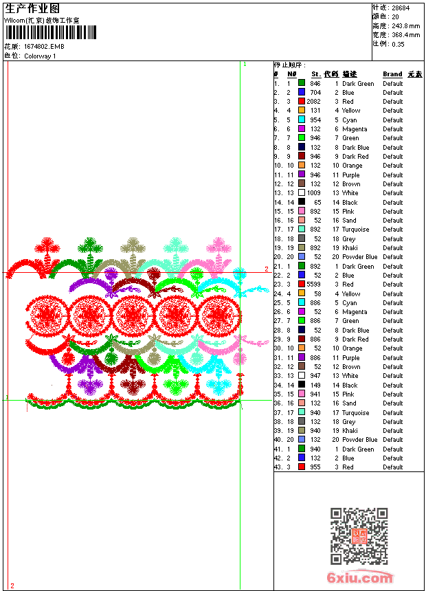 单边定位花 点此上传花版兑乐绣币/现金 emb花版参数: 大小:67.00 KB / 尺寸:368*244[毫米] / 针数:28684针 / 线色:20 / 格式:emb / 版本:9 版带文件需绣花软件方可打开,可配色打印导出各种格式或直接上机绣。如无绣花软件可下载1:1模拟效果图。 PNG图片信息:大小:1.1 (MB) /图宽*高:1394x923(像素) 上传作者( jill*** ) 获得乐绣币:2个 emb下载 1:1图下载 关闭 相似花型推荐: 凤凰栖牡丹图 精品 碎花前胸 标识,橄榄球标志刺绣 标志 刺绣fashion字母 大花 字母 rb002-标志字母刺绣 rb001-标志章仔 群鸟--7包针 水溶 凤凰 米老鼠 蜘蛛 人物 刘德华-乱针绣工艺版 人物-总理在汶川 精品 上一个花样:小熊-贴布绣卡通 下一个花样:凤凰栖牡丹图 精品