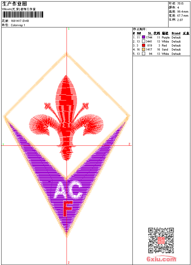 fiorentina-刺绣标志 点此上传花版兑乐绣币/现金 emb花版参数: 大小:32.00 KB / 尺寸:68*99[毫米] / 针数:7515针 / 线色:4 / 格式:emb / 版本:9 版带文件需绣花软件方可打开,可配色打印导出各种格式或直接上机绣。如无绣花软件可下载1:1模拟效果图。 PNG图片信息:大小:0.1 (MB) /图宽*高:257x376(像素) 上传作者( whis*** ) 获得乐绣币:13个 emb下载 1:1图下载 关闭 相似花型推荐: LAZIO-翅膀形章仔标志 PARMA-球队标志刺绣 JUVENTUS-椭圆形标志 AC MILAN-球队标志刺绣 INTER MILAN-五星标志章仔 AS ROMA-章仔标志 樹上小烏 時鐘版-时针刺绣图案 大熊貓 孖寶兄弟 哆啦A夢-刺绣叮当猫 蜂鳥-动物图案 大船-轮船刺绣素材 海洋章仔 老虎蝴蝶 上一个花样:sampdoria-标志章仔图 下一个花样:LAZIO-翅膀形章仔标志