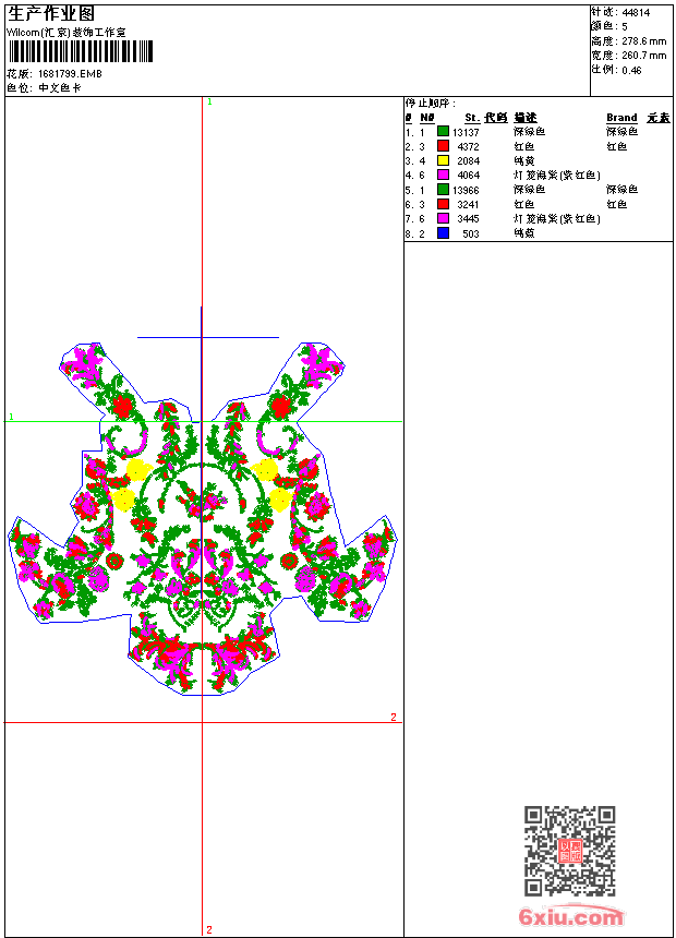 衣服前幅大花 点此上传花版兑乐绣币/现金 emb花版参数: 大小:452.50 KB / 尺寸:261*279[毫米] / 针数:44814针 / 线色:5 / 格式:emb / 版本:2006 版带文件需绣花软件方可打开,可配色打印导出各种格式或直接上机绣。如无绣花软件可下载1:1模拟效果图。 PNG图片信息:大小:0.8 (MB) /图宽*高:987x1054(像素) 上传作者( 4022*** ) 获得乐绣币:3个 emb下载 1:1图下载 关闭 相似花型推荐: 双人马-打马球标志刺绣 水溶窗帘版带 骨头-骷髅头刺绣图案 可口可乐瓶刺绣图案 电脑皇冠图案_皇冠刺绣图案 驯马 可爱小女孩 背靠背 马 跑步的猪 举重-运动刺绣图案 人和鱼-抱着鱼的人刺绣图案 飞机与降落伞标 狮头_狮子头刺绣图案 BOYS英文刺绣图案 上一个花样:忠义千秋-关公-关羽刺绣图案 下一个花样:双人马-打马球标志刺绣