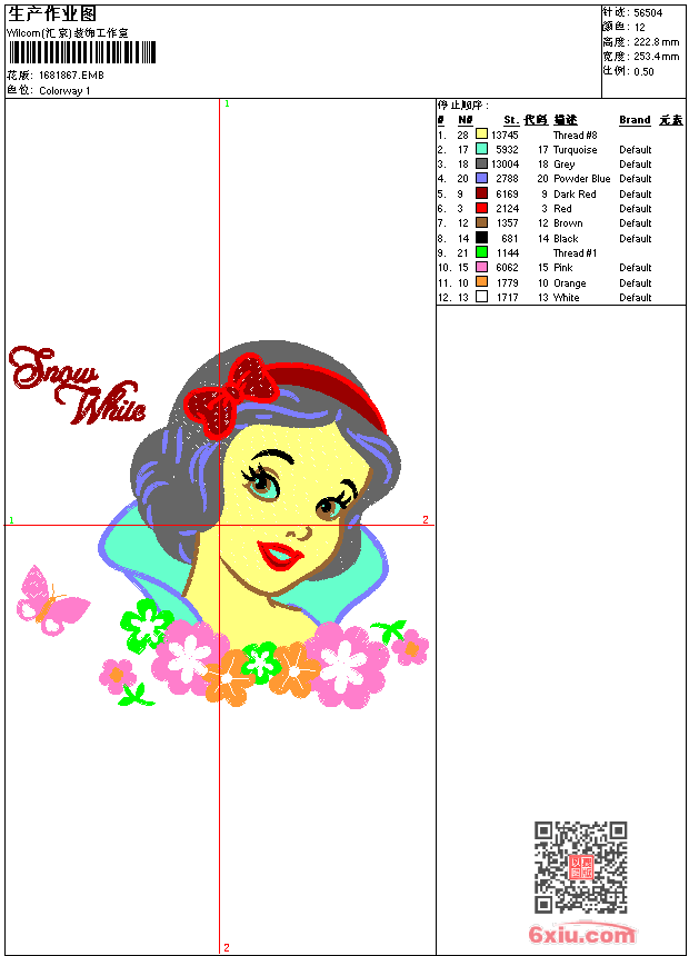 美女-白雪公主 点此上传花版兑乐绣币/现金 emb花版参数: 大小:175.50 KB / 尺寸:253*223[毫米] / 针数:56504针 / 线色:12 / 格式:emb / 版本:9 版带文件需绣花软件方可打开,可配色打印导出各种格式或直接上机绣。如无绣花软件可下载1:1模拟效果图。 PNG图片信息:大小:1.1 (MB) /图宽*高:959x843(像素) 上传作者( h584*** ) 获得乐绣币:20个 emb下载 1:1图下载 关闭 相似花型推荐: 米奇 老虎-动物 跆拳道 抽象小标 super bowl 超级碗 一只蝴蝶 two rose 玫瑰花 one rose 玫瑰花 鳄鱼 春回大地-精品 龙 龙 龙 龙 龙 上一个花样:腰带行运一条龙 下一个花样:米奇